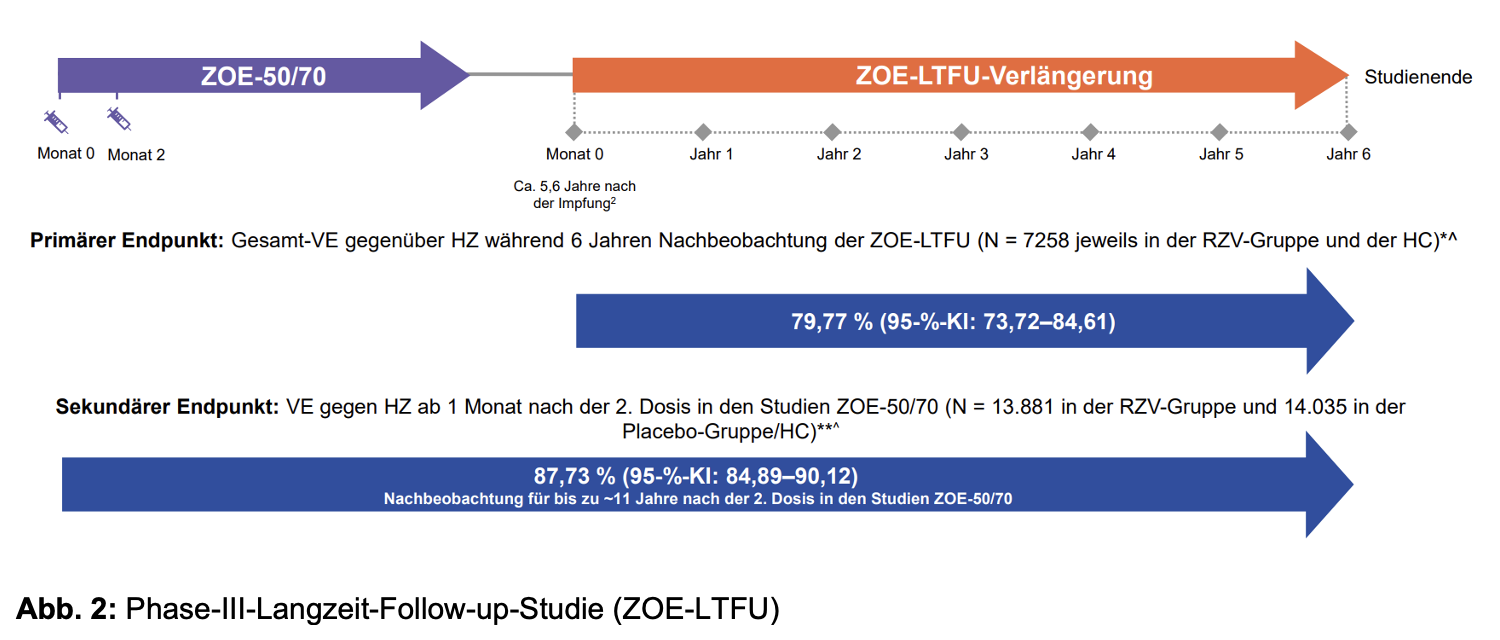 Die ZOSTER-049-Studie ist eine offene Phase-III-Langzeit-Follow-up-Studie, die auf den Ergebnissen der zulassungsrelevanten, randomisierten klinischen Phase-III-Studien ZOE-50- und ZOE-70 aufbaut. Sie untersuchte die Wirksamkeit, Sicherheit und Immunogenität des Impfstoffs bei Erwachsenen, die zum Zeitpunkt der Impfung im Rahmen der der ZOE-50- und ZOE-70-Studien 50 Jahre und älter waren, über einen Zeitraum von 11 Jahren (Abb. 2). Insgesamt nahmen über 7.000 Teilnehmer aus 18 Ländern auf fünf Kontinenten an der Studie teil.