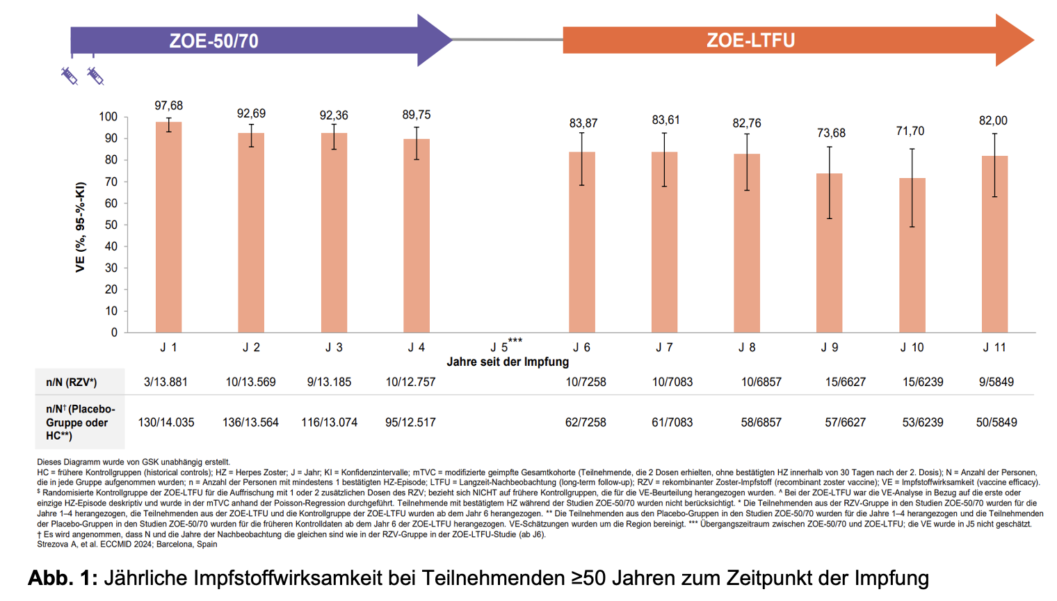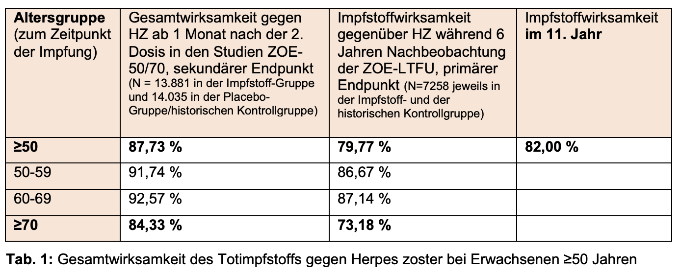 Im Zeitraum vom sechsten bis zum 11. Jahr nach der Impfung (primärer Endpunkt der ZOSTER-049-Studie) lag die Impfstoffwirksamkeit bei 79,7 % in der gesamten Altersgruppe aller Erwachsenen ≥50 Jahren. In der älteren Gruppe der Erwachsenen ≥70 Jahren betrug die Impfstoffwirksamkeit 73,1 %. (Tab. 1). Obwohl sie tendenziell niedriger war als bei den Teilnehmenden zwischen 50 und 69 Jahren, blieb die Wirksamkeit bei den Personen ab 70 Jahren hoch.