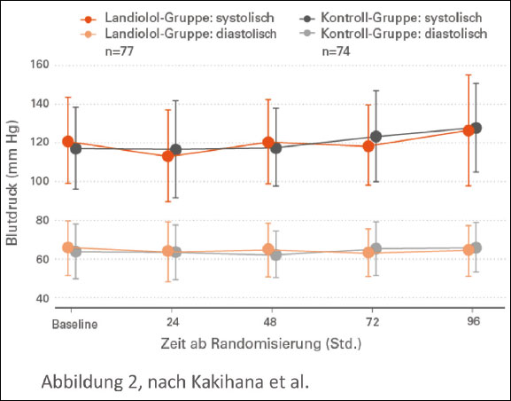 Im Vergleich zur Standardgruppe fand sich in der Landiolol-Gruppe ein signifikant größerer Anteil an Patienten, die 24 Stunden nach Randomisierung die Zielherzfrequenz (60-94 BPM) als primäres Studienziel erreichten (55% gg. 33%, p=0,0031) (Abbildung 1). Diese Wirkung blieb bis Ende des 96-stündigen Behandlungszeitraums bei 42% der Patienten in der Landiolol-Gruppe gegenüber 21% der Kontroll-Gruppe erhalten (p=0,015). Der Blutdruck blieb in beiden Behandlungsgruppen über 96 Stunden stabil (Abbildung 2).