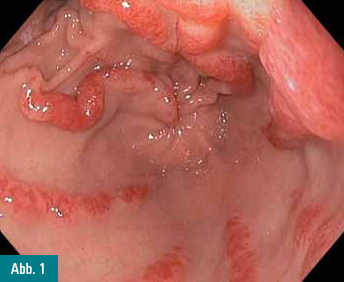 Eine 57-jährige Patientin wurde wegen hochgradiger, hypochromer, mikrozytärer Anämie (Hb 6,7g/dl) und wegen Leistungsschwäche und Müdigkeit vorgestellt. Sie war deshalb in der Vergangenheit bereits mehrfach endoskopiert worden. Während die Coloskopie als unauffällig beschrieben wurde, zeigte sich in den mehreren Magenspiegelungen laut vorliegender Befunde jeweils eine hochgradige Gastritis. In der Histologie fand sich kein Helicobacter.