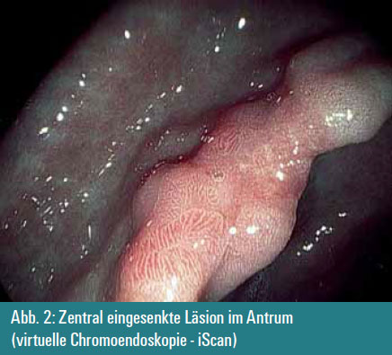 Eine 50-jährige Patientin wird wegen rezidivierender Oberbauchschmerzen zur Gastroskopie überwiesen. Im Bereich des Antrums zeigt sich an der kleinen Kurvatur eine zentral eingesenkte Läsion.