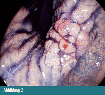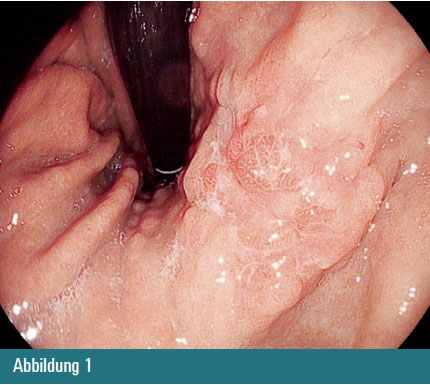 Bei einem 79-jährigen Mann wurde im Rahmen einer Gastroskopie im Bereich des Angulus eine flach erhabene Läsion mit teils eingesenkten Arealen diagnostiziert (IIa-c-Läsion nach der Paris-Klassifikation) (Abbildung 1, 2).