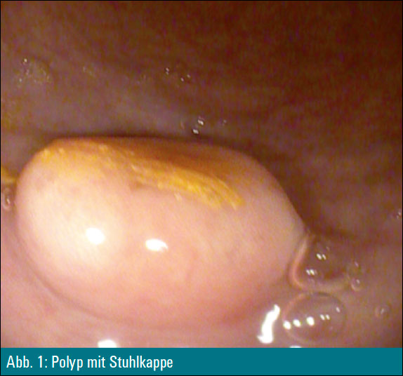 Bei einem 37-jährigen Patienten wurde im Rahmen einer Coloskopie wegen Abdominalschmerzen ein Polyp mit einer Stuhlkappe im Rectum detektiert (Abbildung 1).