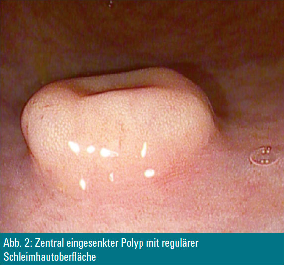 Nach Abspülen des Stuhls und Einsatz der virtuellen Chromoendoskopie mit I-Scan präsentierte sich ein erhabener, zentral eingesenkter, ca. 12 mm messender Polyp mit regulärer Mukosaoberfläche (Abbildung 2). Nach Unterspritzen mit Indigocarmin und NaCl zeigte sich ein positives Liftingsign (Abbildung 3).
