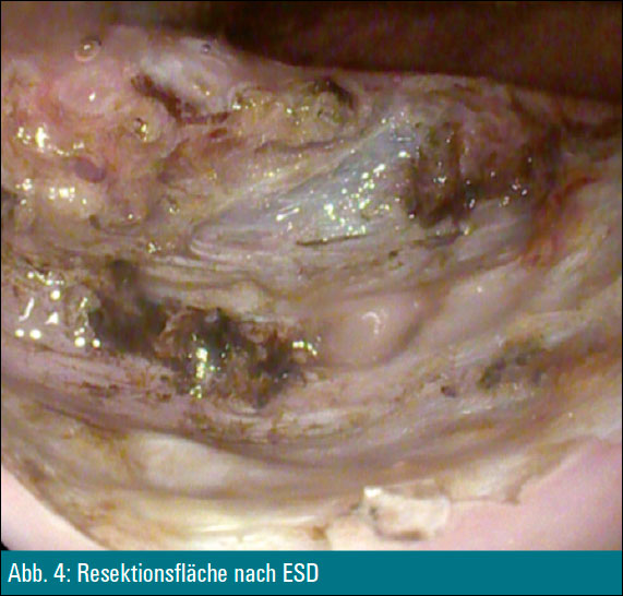 Die Läsion wurde mittels endoskopischer Submukosadissektion abgetragen (Abbildung 4). Das histologische Ergebnis war ein differenzierter neuroendokriner Tumor des Rektums: G1, pT2, L0, V0, R0.