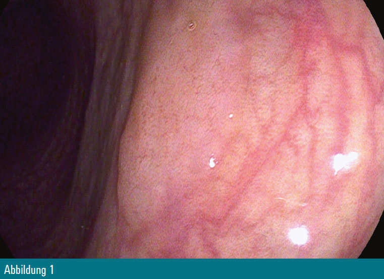 Im Rahmen einer Vorsorgekoloskopie wurde bei einer 57-jährigen Patientin ein flach erhabener, ca. 11 mm messender Polyp (IIA nach Paris-Klassifikation) an der linken Flexur detektiert (Abbildung 1).
