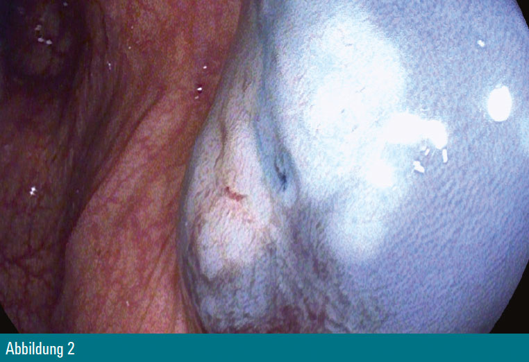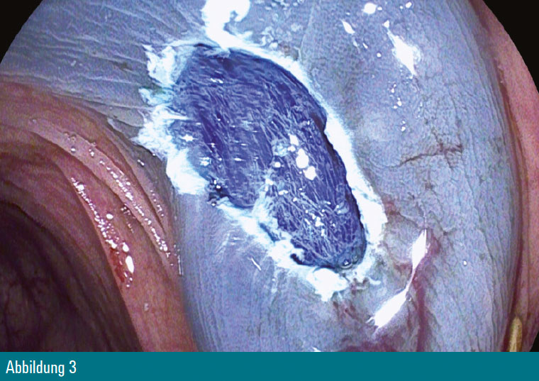 Nach Unterspritzen mit der Indigocarmin-NaCl 0,9%-Lösung und positivem Lifting Sign wurde die Läsion komplett mukosektomiert (Abbildung 2 und 3).