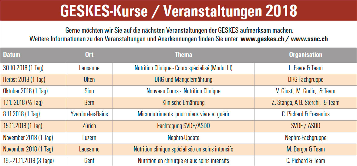 Anlässlich der GESKES-Generalversammlung vom 31.5.2018 wurde einstimmig Frau PD Dr. med. Andrea Kopp Lugli als Vorstandsmitglied für das Ressort „Koordination der Ausbildung“ gewählt. Frau PD Dr. med. Andrea Kopp Lugli übernimmt die Aufgaben als Studienleiterin des ZKE‘s „Certificate of Advanced Studies in Clinical Nutrition“ von Prof. Dr. med. Zeno Stanga, langjähriges Vorstandsmitglied und Studienleiter ZKE. Frau PD Dr. med. Andrea Kopp Lugli ist Leitende Ärztin am Universitätsspital Basel (interdisziplinäre IMCU, Departement für Anästhesie, operative Intensivbehandlung, präklinische Notfallmedizin und Schmerztherapie).