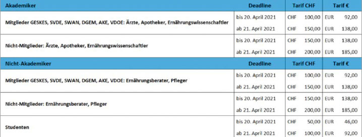 Die Dreiländertagung wird gemeinsam von der GESKES (Gesellschaft für Klinische Ernährung Schweiz), dem SVDE (Schweizerischer Verband der Ernährungsberater/innen), der AKE (Arbeitsgemeinschaft klinische Ernährung, Österreich) und der DGEM (Deutsche Gesellschaft für Ernährungsmedizin) vom 24. bis 26. Juni 2021 organisiert. Das virtuelle Programm steht bereits (www.nutrition2021.ch/programm)!
